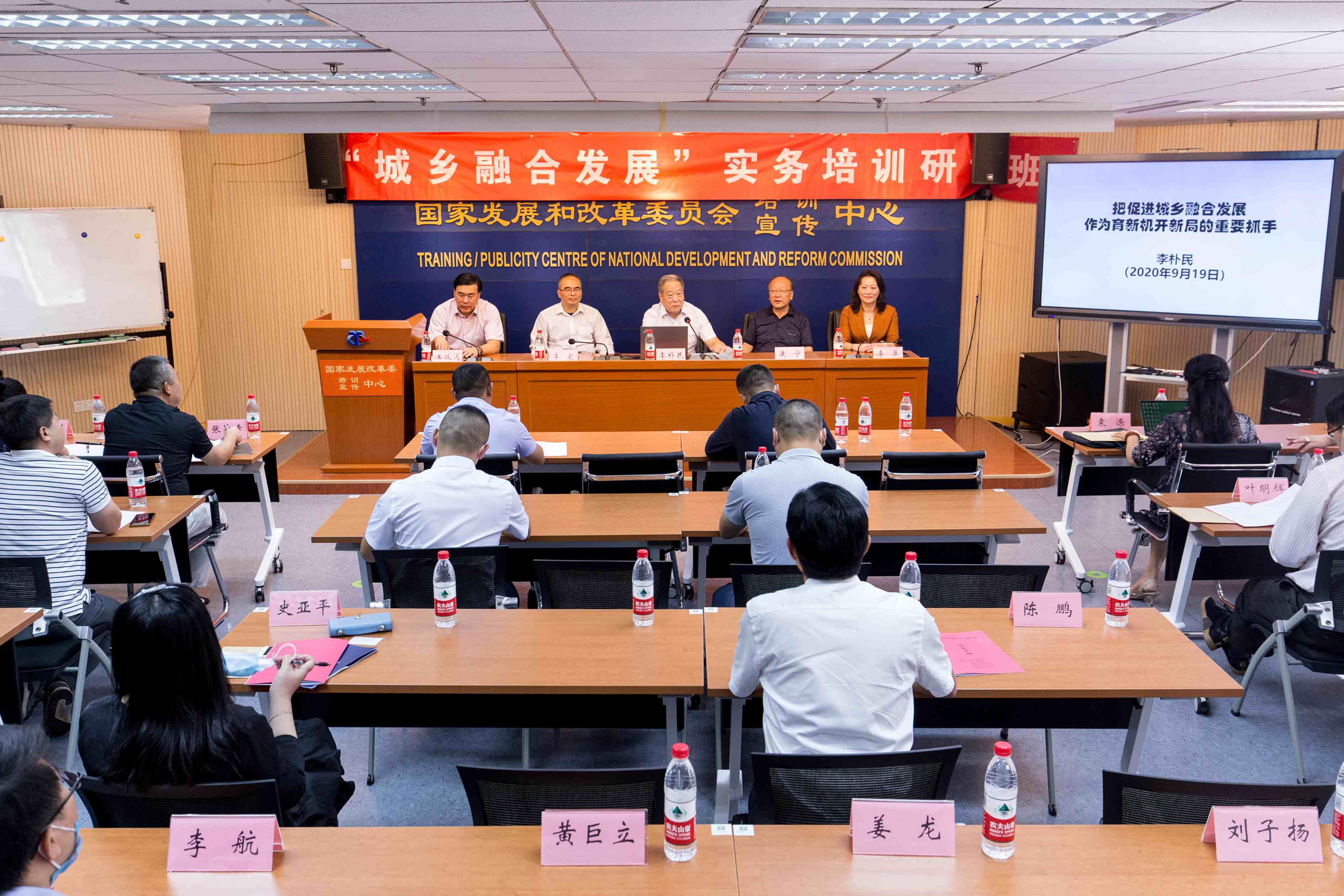 中国经济导报、中国发展网讯 党的十九届四中全会提出“实施乡村振兴战略,完善农业农村优先发展和保障国家粮食安全的制度政策,健全城乡融合发展体制机制,构建区域协调发展新机制,形成主体功能明显、优势互补、高质量发展的区域经济布局”。为深入学习贯彻党的十九大和四中全会精神,加快城乡融合发展,统筹推进脱贫攻坚与乡村振兴战略实施,2020年9月19日-20日,由中国人力资源开发研究会主办,中城特色小镇规划研究院承办,南京利安物联网科技有限公司、云南振隅文化旅游发展有限公司协办的第二届“城乡融合发展实务”培训研讨班在国宏大厦举办。国家发展改革委原秘书长、中国人力资源开发研究会会长李朴民同志,中国人力资源开发研究会副会长李震同志,城乡融合与人才开发研究中心主任李萍同志出席开班式,中城特色小镇规划研究院院长王政道同志主持开班式。研讨班还邀请了国家发展改革委、农业农村部、文化和旅游部等有关部委主管或研究相关政策的资深专家进行现场授课。